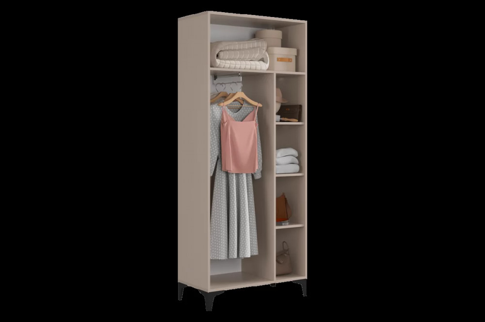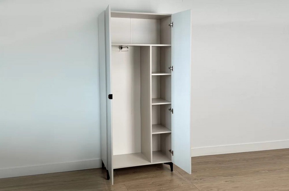 Шкаф оснащён надёжными металлическими ручками и имеет удобное внутреннее наполнение: справа расположены полки, а слева — штанга для вешалок. Это позволяет рационально использовать пространство и разместить различные типы одежды.