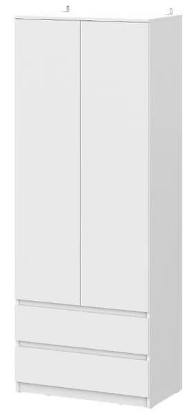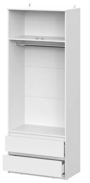 Шкаф имеет 2 распашные створки, за которыми располагается отсек со штангой и двумя полками. Также в нижней части шкаф имеет 2 выдвижных ящика, которые обеспечивают дополнительное место для хранения вещей.