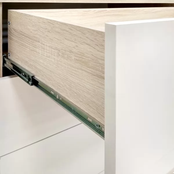 Выкатные ящики с шариковыми направляющими полного выдвижения – работают тихо, надежно, позволяют увидеть весь ящик целиком.