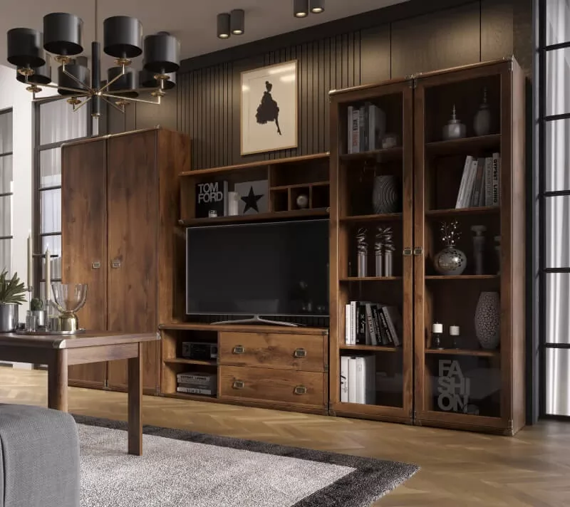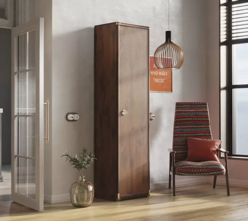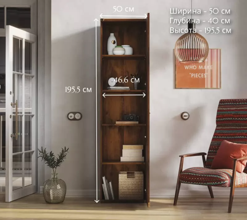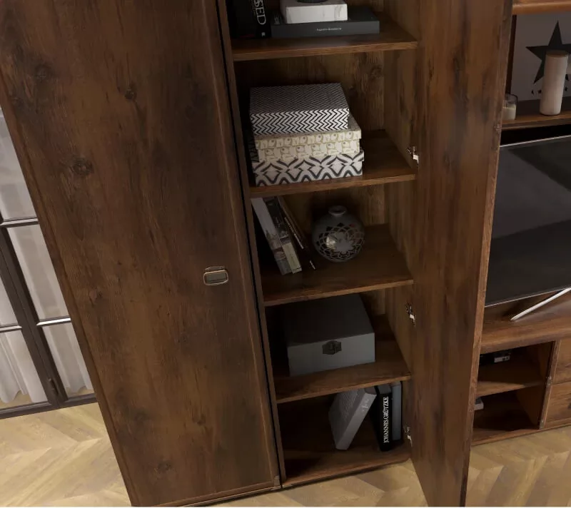 Шкаф имеет пять глубоких ниш, состоящих из четырех съемных полок. Благодаря универсальной дверце, которая может навешиваться как слева, так и справа, вы сможете удобно расположить шифоньер в комнате. Латунные накладки, стильная ручка и отделка из МДФ делает эту мебельную единицу центром внимания в любом уголке помещения.