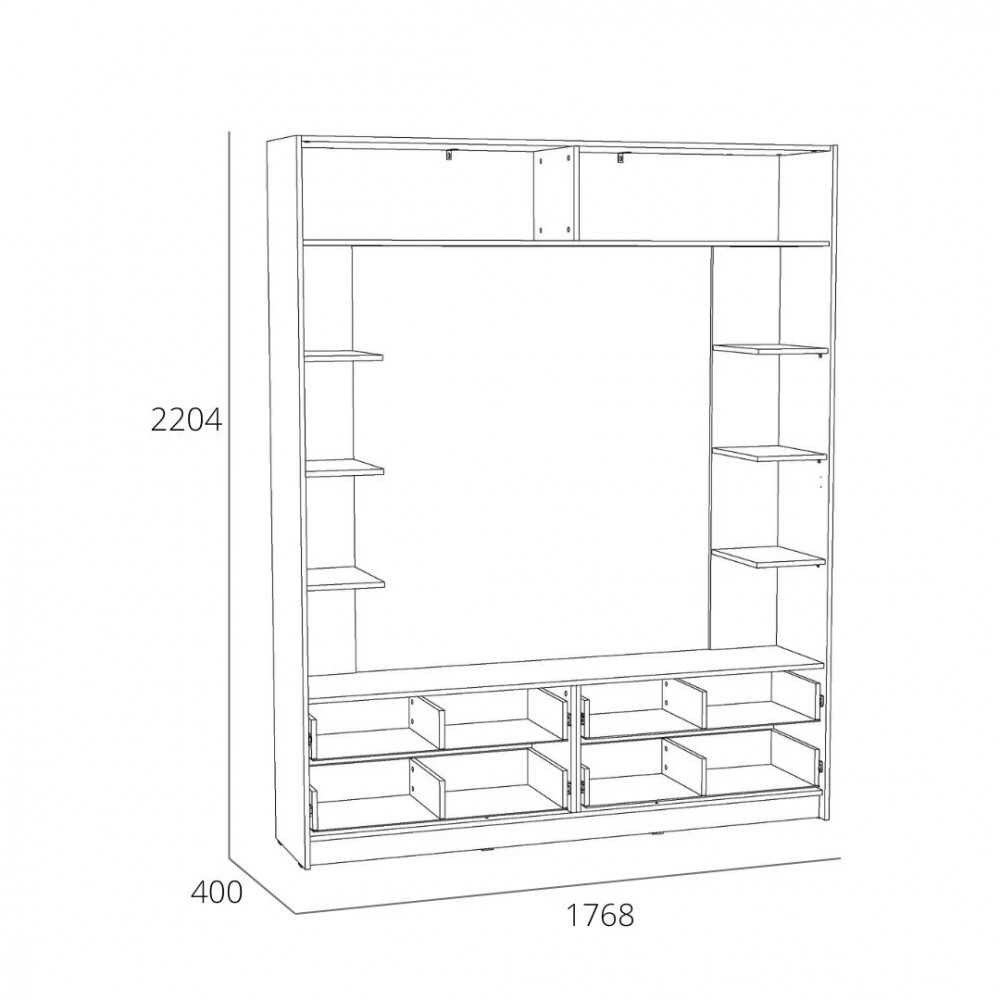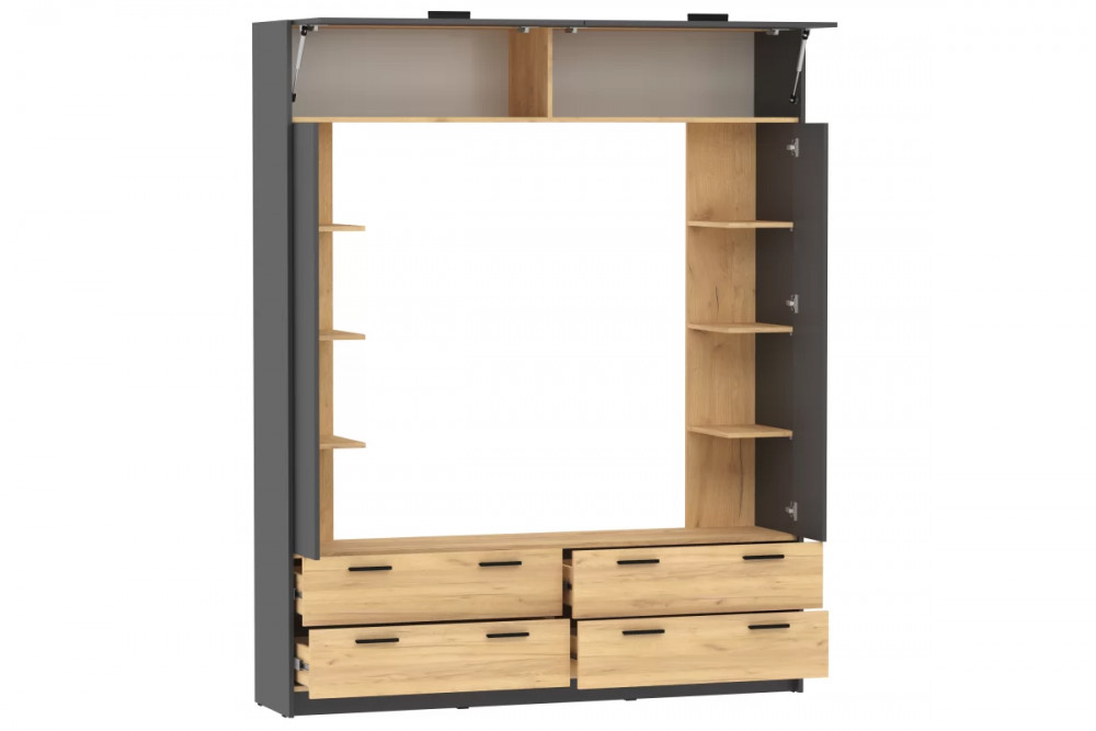 Шкафчики в верхней части стенки оснащены удобными дверками с открытием вверх. Скрытые полки за распашными дверками в средней части изделия придутся по вкусу любителям книг и интерьерных мелочей. Нижнюю часть стенки занимают четыре вместительных выдвижных ящика на шариковых направляющих, позволяющие аккуратно разместить вещи. Шкаф является модульным, что позволяет комбинировать его с другими шкафами и тумбами из одноименной коллекции. Лаконичный дизайн шкафа гармонично подчеркивается черными ручками.