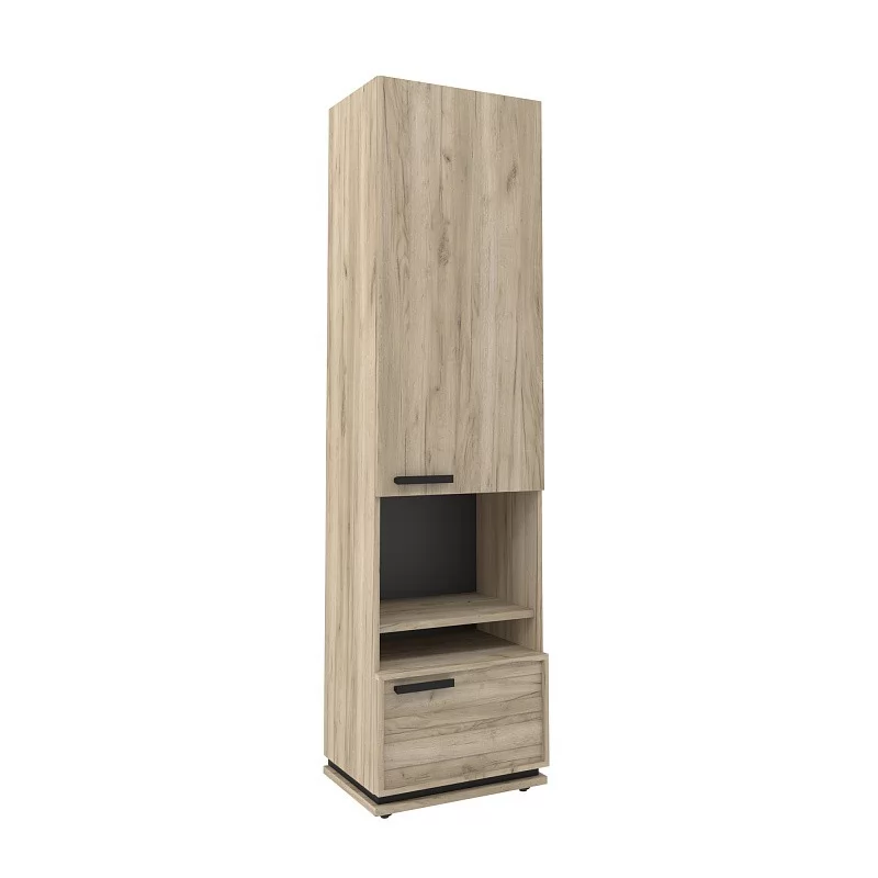 Компактность высокого шкафа МЦН сочетается с вместительностью, что идеально подходит даже для небольших гостиных. Это удобный и многофункциональный тип мебели для хранения. Его фасады перенавешиваются. На открытой полке можно разместить фотографии, книги или элементы декора, а за глухими фасадами спрятать личные вещи от посторонних глаз. Регулируемые опоры шкафа позволят компенсировать незначительные неровности пола. А двойной контрастный цоколь – интересная фишка.