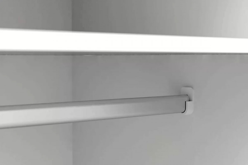 Шкаф трехстворчатый «Соната» с непроходными стенками будет одинаково гармонично смотреться как в составе мебельной композиции, так и установленный отдельно. В левой верхней части шкафа находятся две стационарные полки со штангой для одежды, правая верхняя часть представляет собой две стационарные и три съемные полки. Нижняя секция оборудована тремя выдвижными ящиками с фасадами, декорированными прорезными ручками, в которых можно хранить предметы, имеющие более утилитарное назначение.