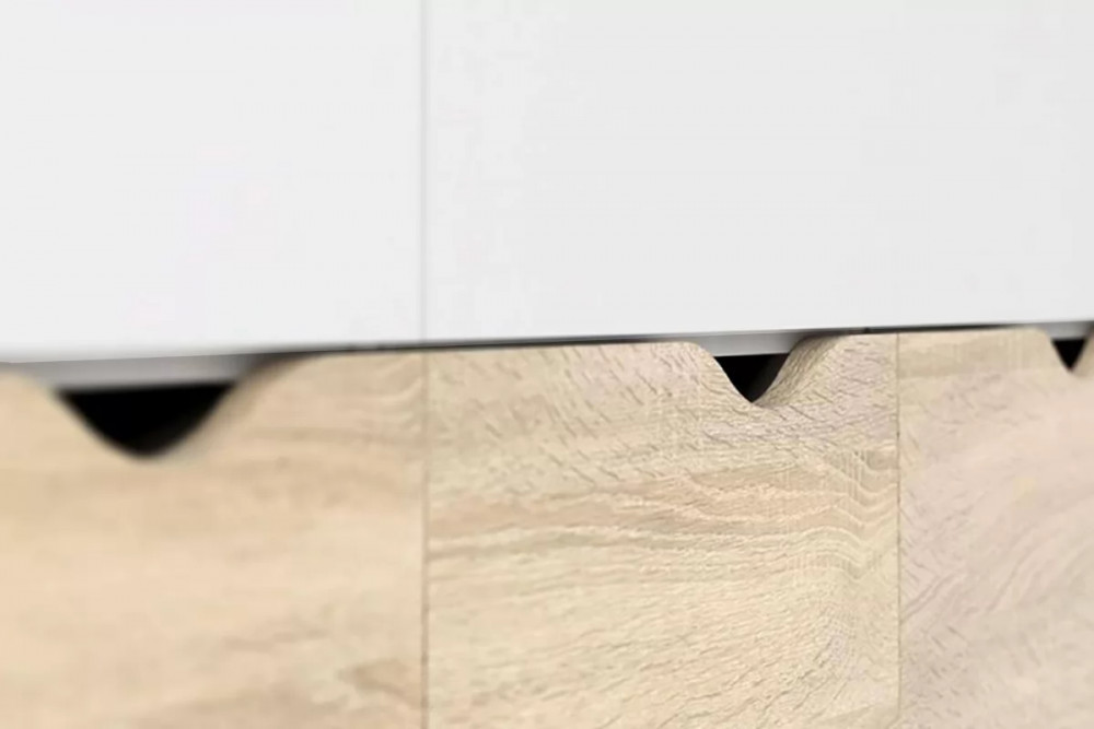 Серия «Соната» отличается простотой и натуральностью, выполнена в естественных тонах. В дизайне отчетливо улавливаются отсылки к скандинавской эстетике: чистые линии корпуса, использование белого цвета в отделке фасадов, расставленные в стороны высокие стильные опоры, выполненные из массива березы.