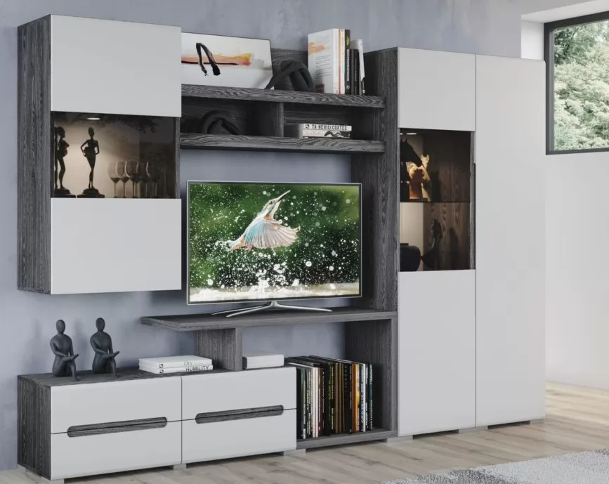 Фасады МДФ под пленкой ПВХ, петли с доводчиком. Особенностью серии является интегрированная ручка, которая придает гостиной индивидуальность и практичность.