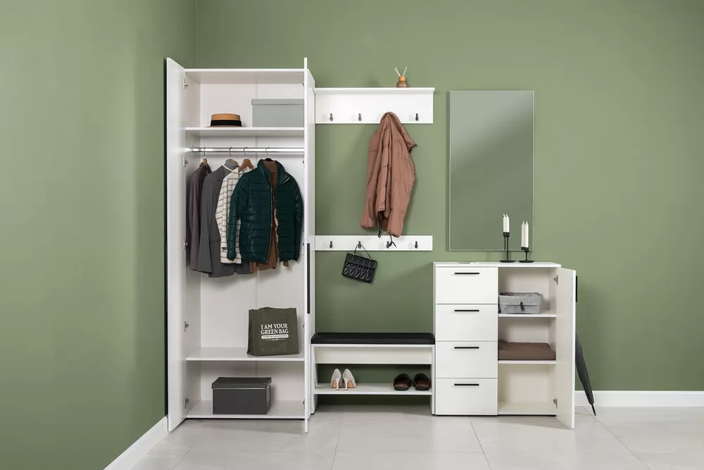 Вместительный шкаф полноразмерной глубины можно дополнить тумбой для обуви с мягким сиденьем и нишами для хранения, зеркалом и минималистичными вешалками.