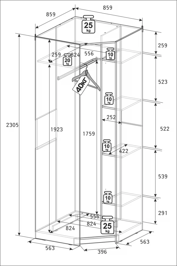 | Размер (ВхШхГ): | 2305х859х859 мм |