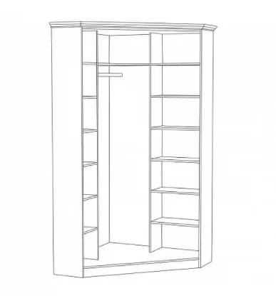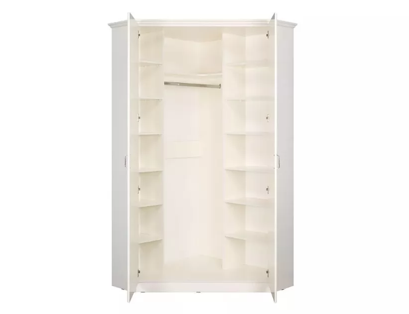 Изысканный угловой шкаф в колониальном стиле. Вместительная система хранения поможет организовать в спальне практичную гардеробную зону. За двумя распашными дверцами расположены два вертикальных блока с полками для одежды, глубокая ниша со штангой для вешалок и компактная антресоль.