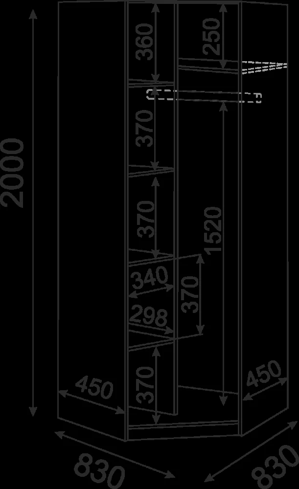 2. Шкаф имеет отделение со штангой для вещей на вешалках , полку над ней и секцию с 4 полками.