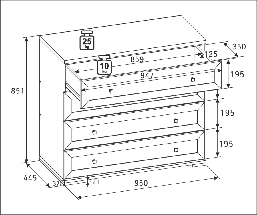 Для спальни ХАРРИС разработаны 3 варианта комодов различной ширины. Комоды с вместительными выдвижными ящиками на шариковых направляющих оптимально дополнят систему хранения в большой или маленькой комнате.