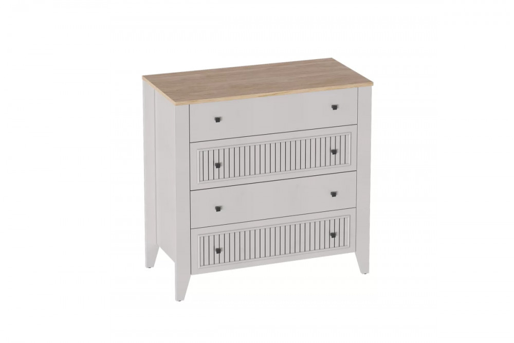 Комод с 4 ящиками Валенсия выполнен из (ЛДСП) в комбинации Дуб натуральный светлый / Персидский жемчуг.