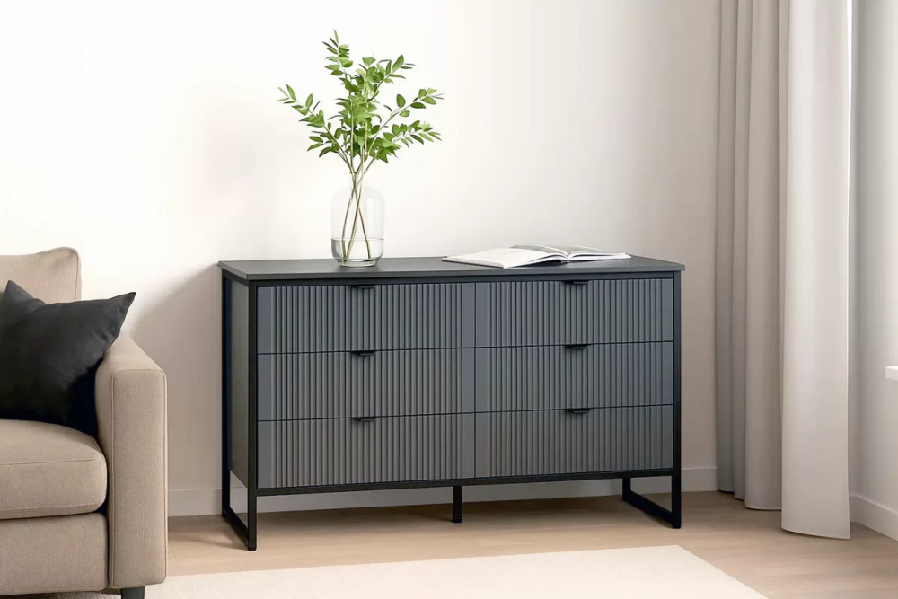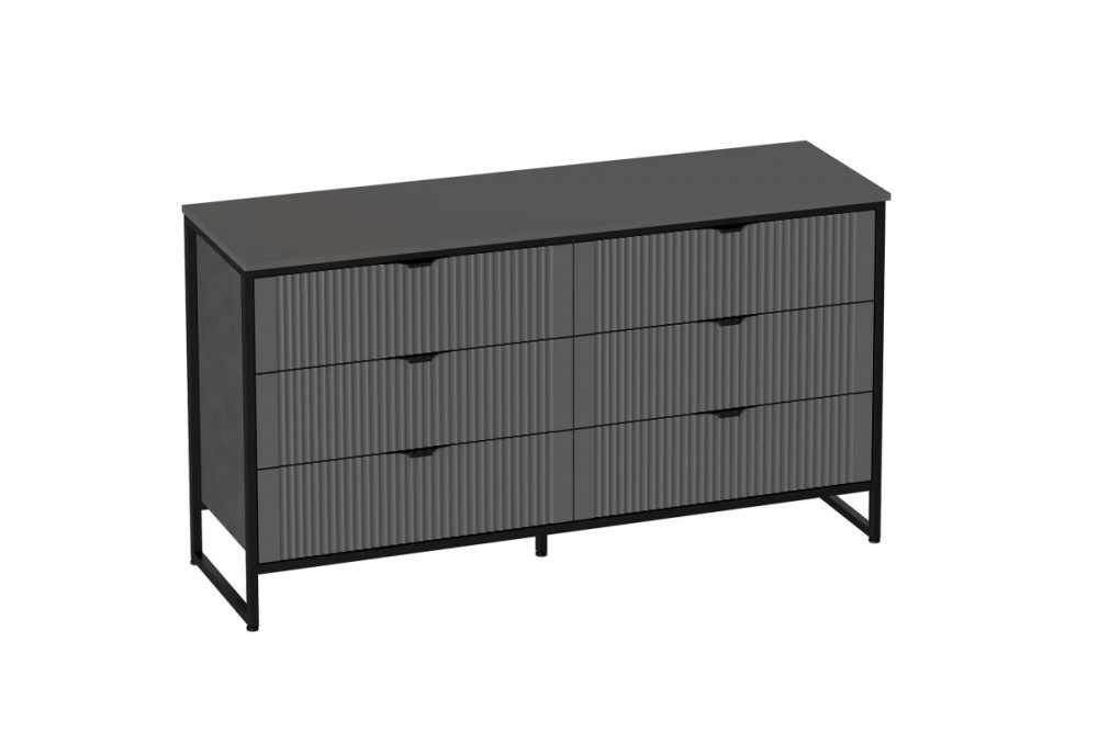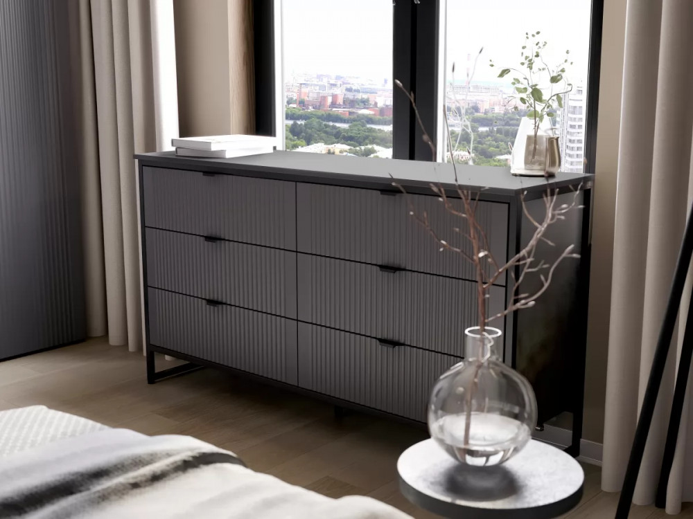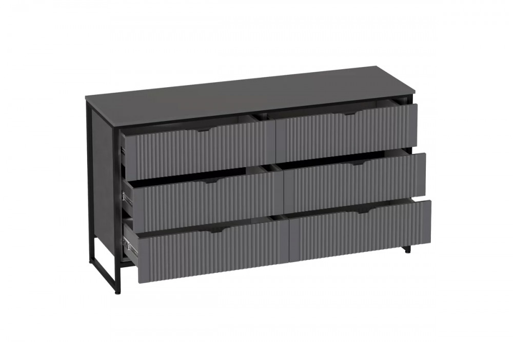 Комод "Нора" на металлокаркасе состоит из выдвижных ящиков, что позволяет удобно хранить вещи и поддерживать порядок в комнате. Внутреннее пространство разделено стенкой на два отделения, в каждом из которых установлены по три выдвижных ящика на шариковых направляющих с доводчиками. Он выполнен из безопасных, качественных материалов (лдсп и мдф), что гарантирует долговечность и сохранение первоначального вида на протяжении долгого времени.