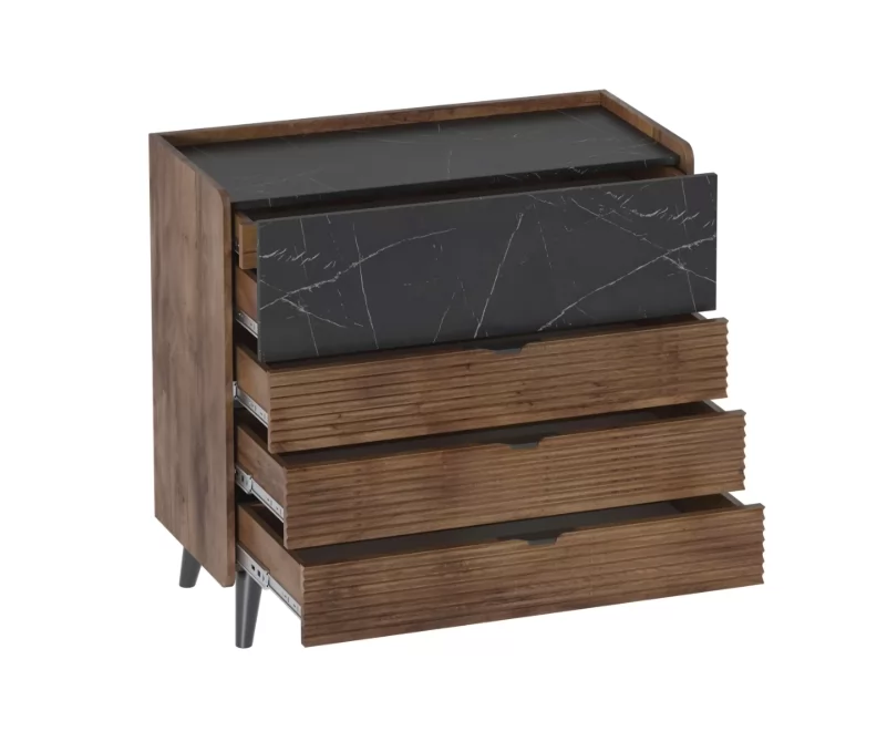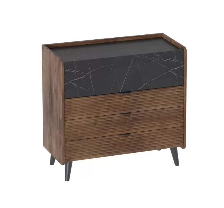 Привлекающий внимание легкостью и стильным оформлением, комод "Браун" не только украсит ваш дом, но и порадует своей функциональностью. Корпус комода и фасад большого ящика изготовлены из ЛДСП, декор на фасадах малых ящиков – из МДФ, стильные и устойчивые опоры - из массива березы.