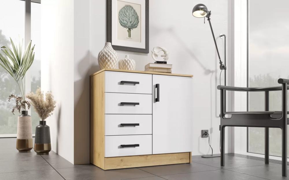 Комод состоит из четырёх выдвижных секторов, а также отдела с полкой, закрытого распашной дверцей. Такая конструкция подходит для хранения книг, аксессуаров и любых других вещей, необходимых вам.