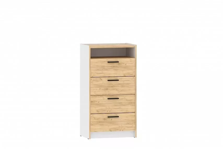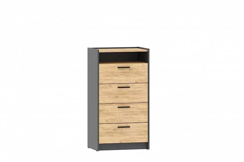 Комод оснащен четырьмя выдвижными ящиками, которые открываются плавно и бесшумно благодаря шариковым направляющим, открытой нишей для удобного хранения вещей, а также представлен в двух размерах, чтобы точно уместиться в параметры вашей комнаты. Черные ручки комода гармонично контрастируют с песочным оттенком фасада.