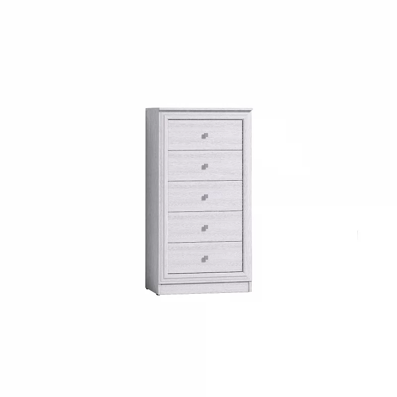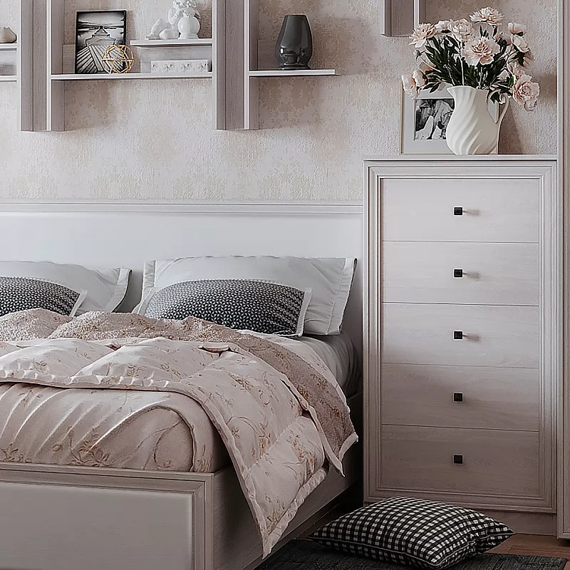 Используйте высокий и узкий комод в спальне как тумбу под телевизор или туалетный столик. Целых пять выдвижных ящиков глубиной 30 см, высотой 14 см и шириной 47 см каждый обеспечат большую зону для хранения одежды и белья. Они оснащены шариковыми направляющими полного выдвижения, благодаря чему вся полезная площадь ящика расходуется рационально, а установить их легко даже для новичка.