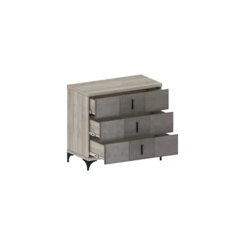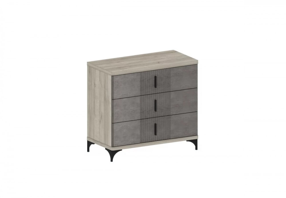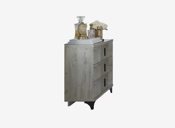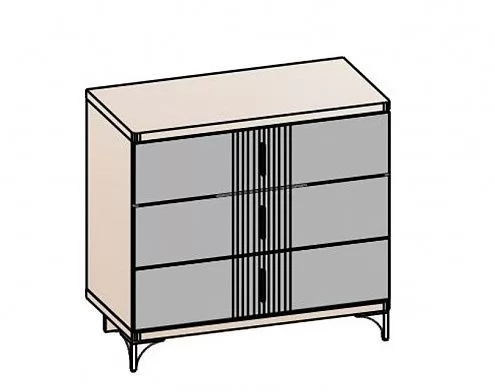 Фасады представлены как в однотонном так и в комбинированном варианте: створки из МДФ 16 мм под пленкой ПВХ. В комодах выдвижные ящики укомплектованы направляющими полного выдвижения. Дно ящика и задняя стенка выполнены из ХДФ, которое вставляется в паз. Фрезерованные крышки из ЛДСП 32 мм облицованы кромкой ПВХ толщиной 1 и 2 мм.