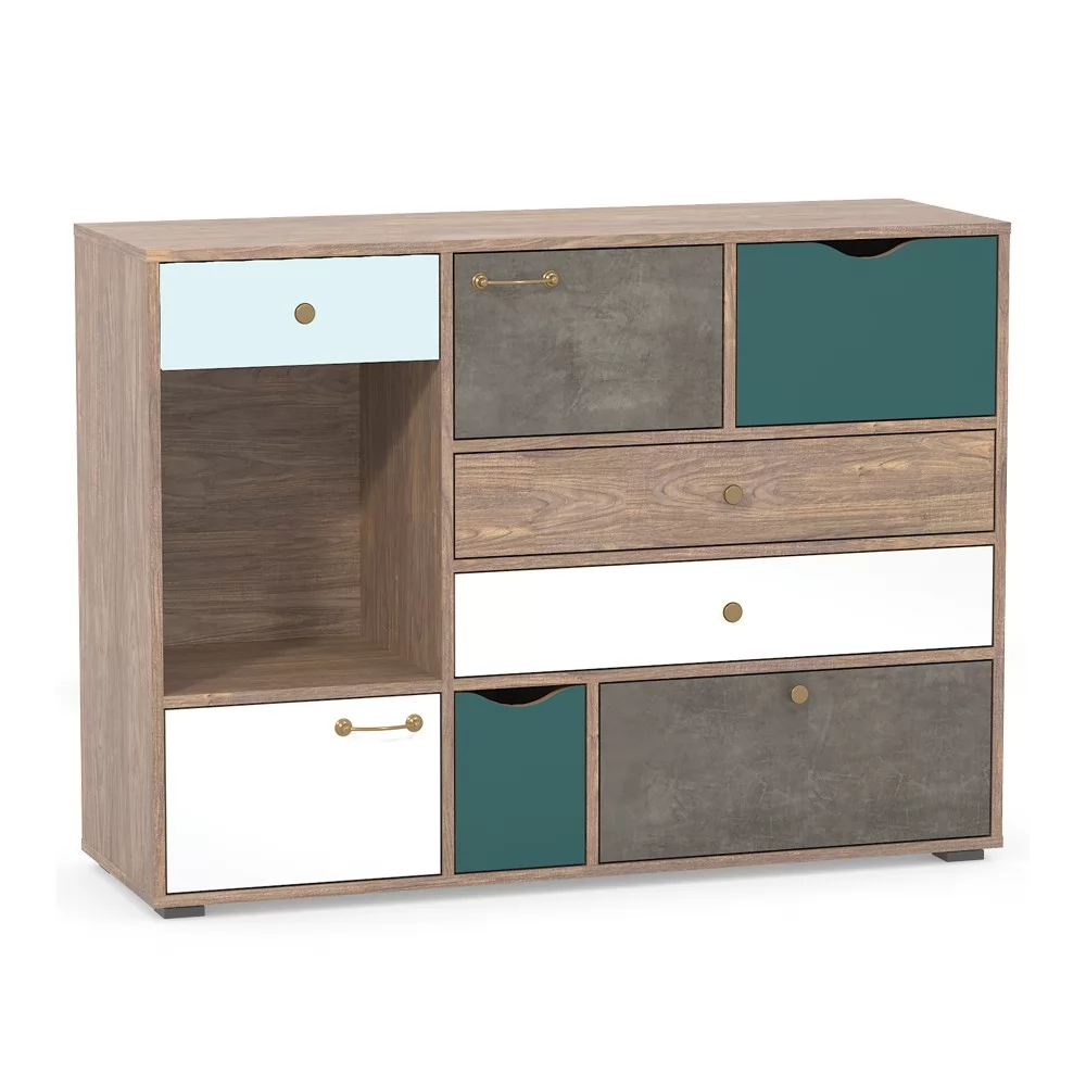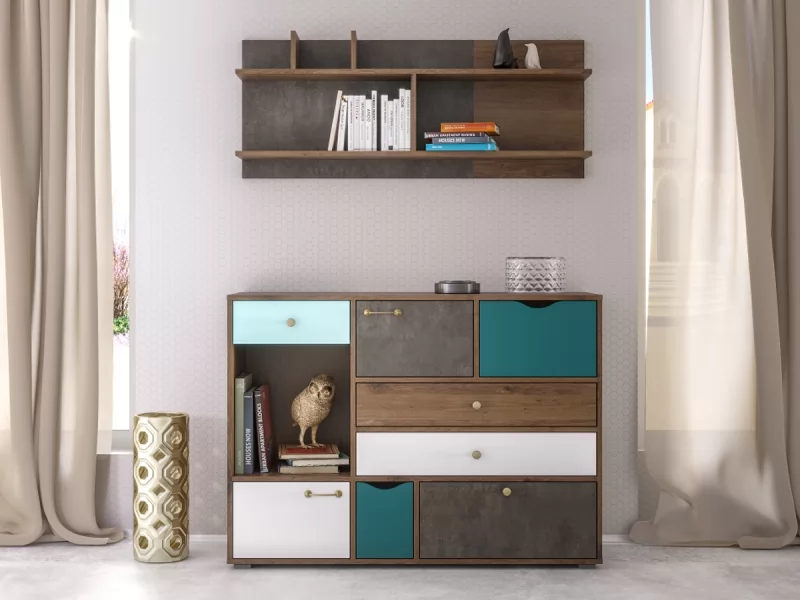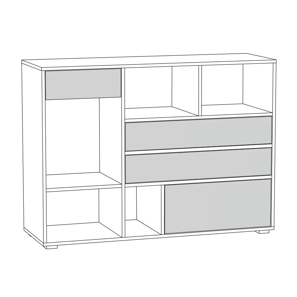 Комод "Вайс" №10.104 включает в себя открытые и закрытые ниши, а также четыре выдвижных ящика. Нижний фасад с ручкой-вырезом является ящиком-шкатулкой.