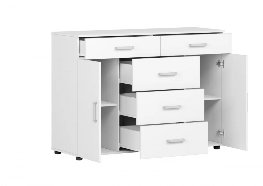 Включает в себя 5 выдвижных ящиков на роликовых направляющих, длиной 400 мм, и 2 закрытых ниши с полками.