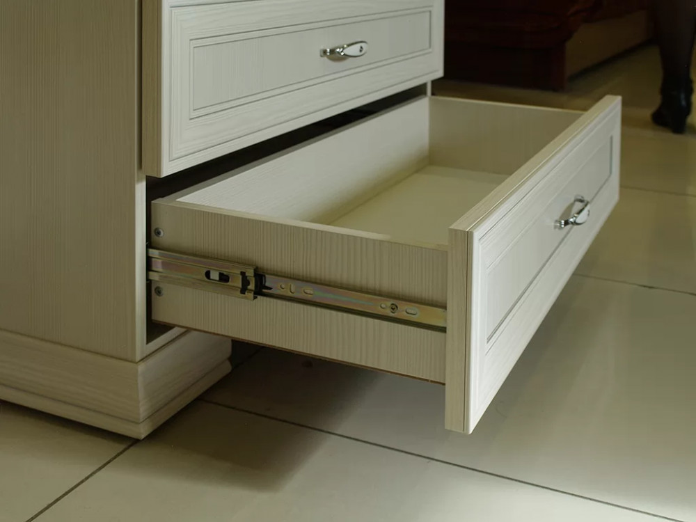 Спальня «Венеция» выполнена в классическом стиле и отлично впишется в любой интерьер. Регулируемые опоры. Петли с доводчиками на всех фасадах. Шариковые направляющие полного выдвижения. Кровати комплектуются ортопедическим основанием на ножках или с подъемным механизмом. Ручки металлические цвет – «Хром глянцевый» с белой вставкой.