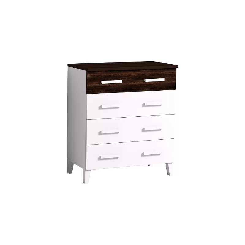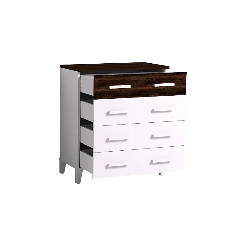 Комод Норвуд идеально подходит для хранения постельного белья и одежды для сна. Столешница толщиной 22 мм в декоре Орех Шоколадный и фасад верхнего ящика из дерева с брашировкой контрастируют с белым декором модуля. Четыре выдвижных ящика на направляющих полного выдвижения глубиной 350 мм открываются/закрываются легко и плавно. Ножки со скосом значительно облегчат процесс уборки в спальне.