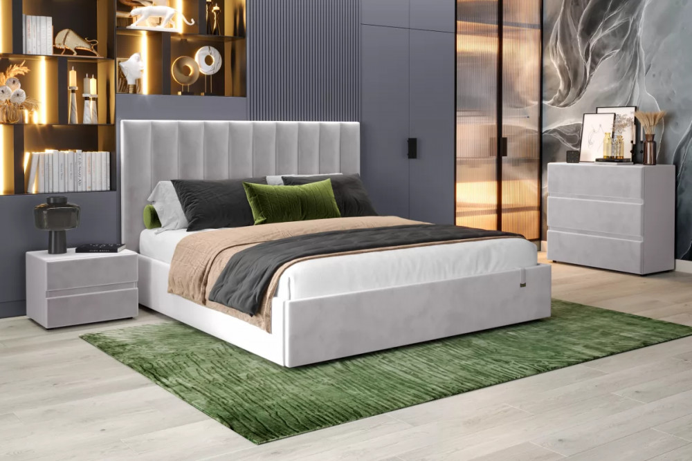 Кровать «Ingrid» подойдет для современных интерьеров спален, впишется в стиль ретро и скандинавский минимализм. Обивка будет отлично сочетаться с любыми цветовыми оттенками отделки и мебели. Кровати выполнены в нейтральных и ярких тканях велюр, что позволяет подобрать подходящий вариант почти под любой интерьер. Изголовье имеет прямоугольную форму, повторяя очертания кровати. Дизайн модели отличается высоким изголовьем с вертикальными строчками и углублениями.