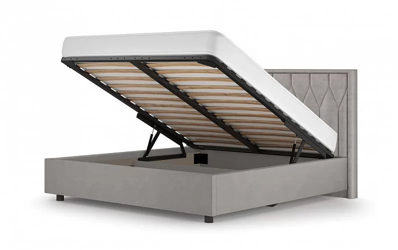 Каркас кровати выполнен из ЛДСП, особую прочность кровати придает металлический держатель основания из стали 2 мм. Подъемное основание оснащено надежным газлифтом.