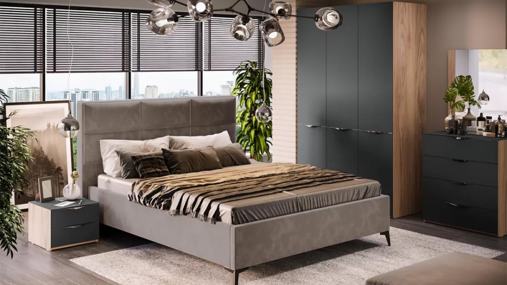 Спальный гарнитур «Порто» стандартный Яблоня Беллуно, Графит софт, Велюр Графит
