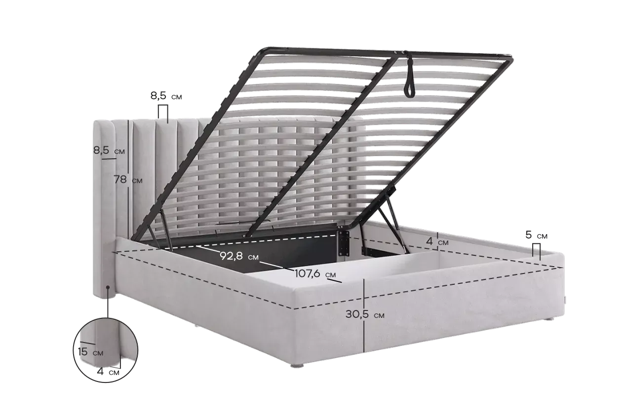 В комплект кровати входит основание с подъемным механизмом, что позволяет вам использовать пространство под кроватью для хранения одежды, постельных принадлежностей и других вещей. Это практичное решение, позволяющее оптимизировать пространство и поддерживать порядок в спальне.