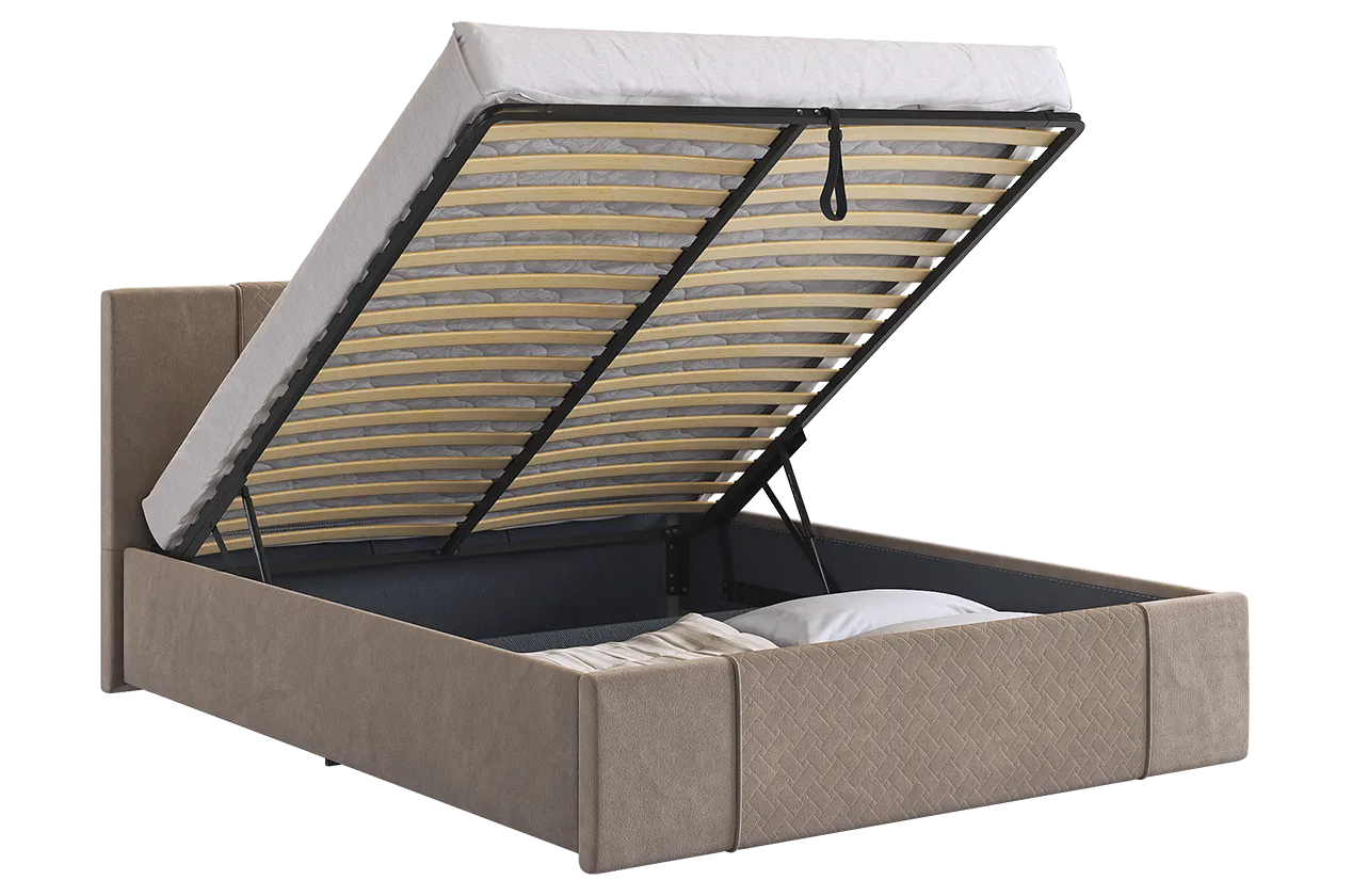 Подъемный механизм позволяет легко поднять верхнюю часть кровати и использовать вместительный ящик для хранения белья или других вещей.