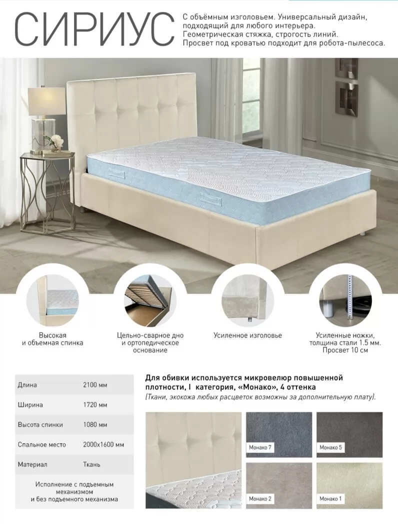 К преимуществам кровати «Сириус» можно отнести красивое объемное изголовье, которое придает модели стильный и современный вид. Модель сконструирована так, чтобы спинку можно было придвинуть вплотную к стене, плинтус на полу не будет помехой. Просвет под кроватью подходит для любых моделей роботов-пылесосов. Кроме этого, кровать укомплектована стальной рамой по всему периметру основания и усиленными ножками диаметром 50 мм.