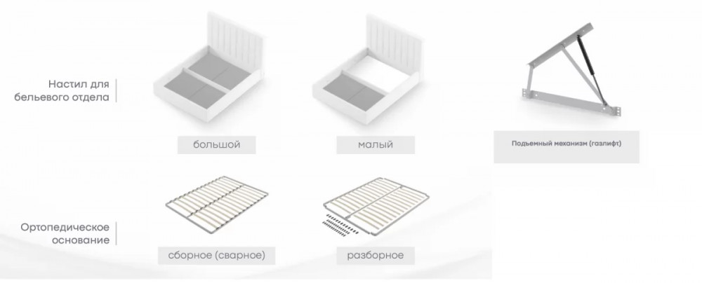 | Основание | Основание ортопедическое разборное, Настил напольный ЛДСП (большой), Настил напольный ЛДСП (малый), Основание ортопедическое сборное |