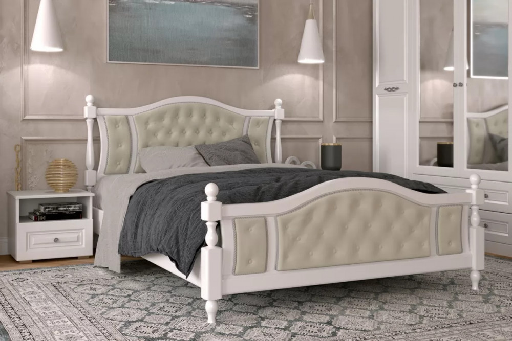 Выполнена из массива сосны, что придает кровати прочность, долговечность и экологичность. Покрыта защитным слоем высококачественного лака. Изголовье кровати сделано из ЭКО-кожи. Точеные детали придают кровати грациозность.