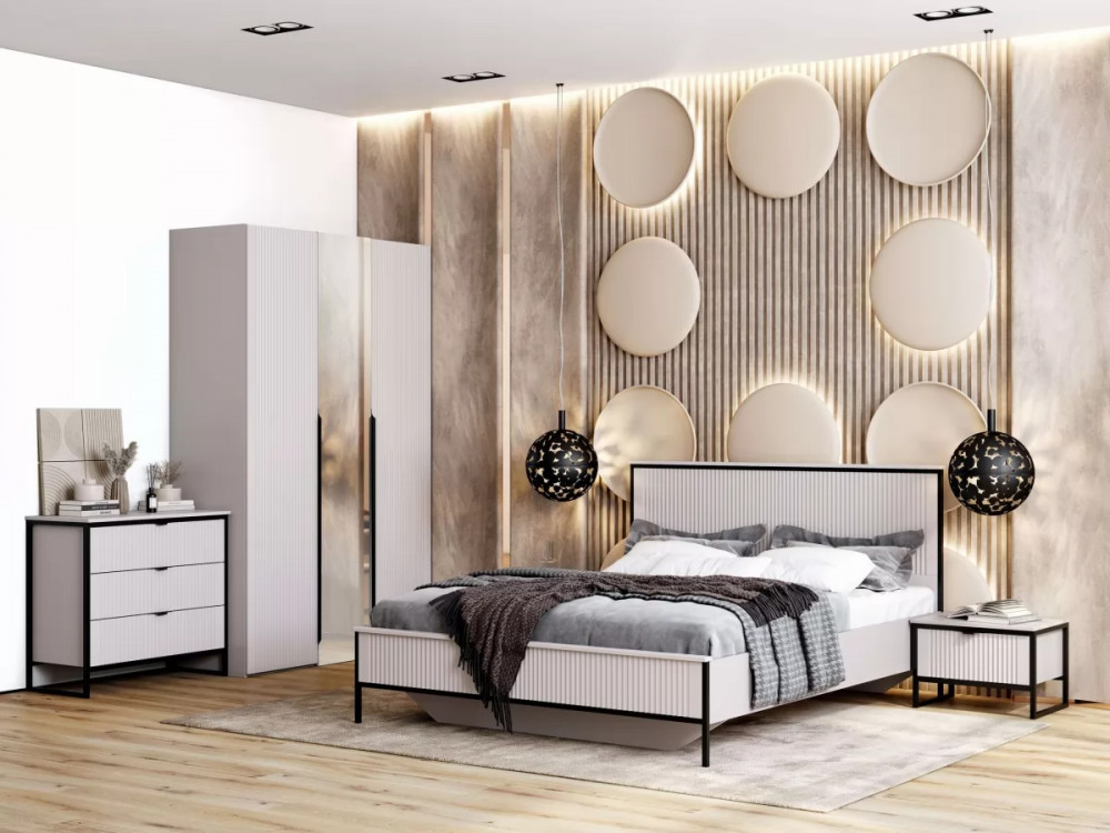 Коллекцию модульной спальни "Нора" отличает современный оригинальный стиль. Декоративная продольная фрезеровка на МДФ фасадах и опоры на металлокаркасе цвета черная эмаль соответствуют модным тенденциям этого года в ведущих зарубежных коллекциях.