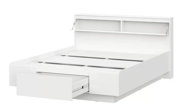 Подиумная система опоры кровати создает парящий эффект и придает грациозности интерьеру. Массивное изголовье оборудовано двумя скрытыми ящикам с откидными створками для хранения необходимых в зоне сна предметов. Нижний щеток кровати в своей центральной части имеет крупногабаритный выкатной ящик с усиленным дном.