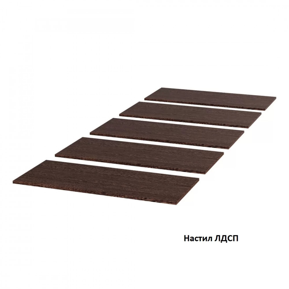 В комплект не входит настил. Кровать дополнительно можно доукомплектовать настилом ДСП, ЛДСП, реечным настилом, ортопедическим основанием с подъемным механизмом, Л-01 (ящик для белья). Мягкое изголовье в комплекте