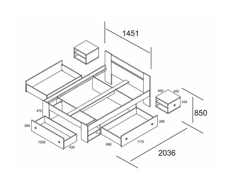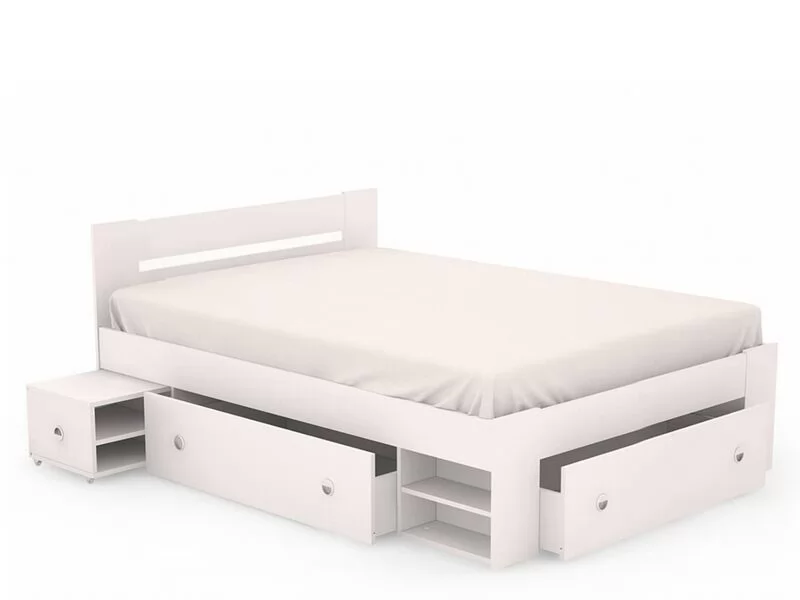 В комплекте: три ящика для белья, две выдвижные тумбы прикроватные.