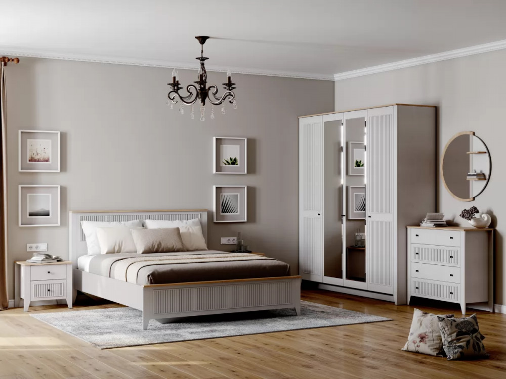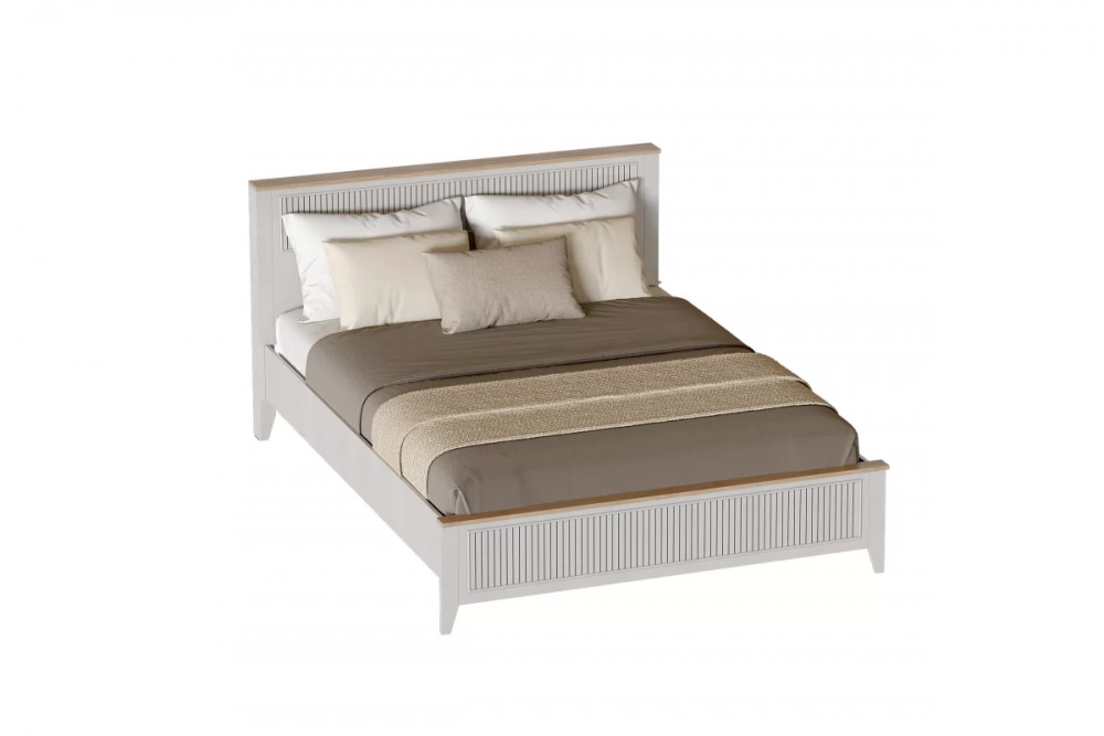 Кровать Валенсия выполнена из ЛДСП в комбинации Дуб натуральный светлый / Персидский жемчуг и имеет спальное место 1600*2000 мм. УФ-фотопечать полосок на изголовье и изножье в обрамлении пластиковых молдингов придает изделию оригинальный стиль современной классики. Кроватное основание с деревянными ламелями встроено в конструкцию кровати. Высота опор 104 мм. На опорах размещены войлочные подпятники.