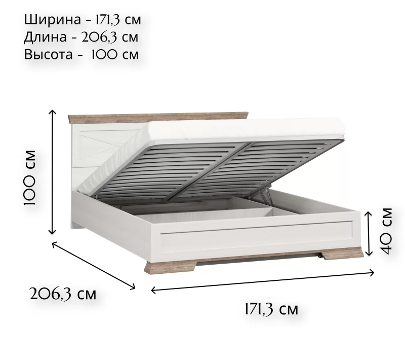 Кровать оснащена подъемным механизмом и предоставляет дополнительное место для хранения подушек, одеял и других габаритных элементов. Спинки декорированы планкой из МДФ и шпросами, что придает кровати индивидуальность.