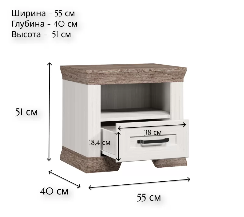 Тумбочка имеет выдвижной ящик на шариковых направляющих и открытую полочку, где вы можете разместить пижаму, аксессуары, блокноты и другие важные предметы. Верхняя столешница предоставит прямой доступ для будильников, очков, телефонов, настольных ламп и ночников.