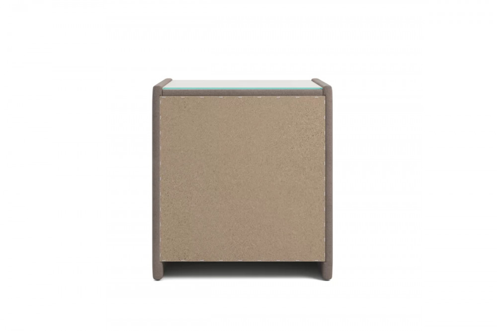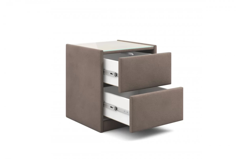 Тумба обтянута высококачественным велюром, что придает ей особый уют и комфорт. Имеет стеклянную столешницу и два вместительных выдвижных ящика с механизмом Push to open. Скругленные торцы модели, минимизируют риск удариться в темноте.
