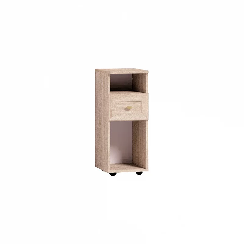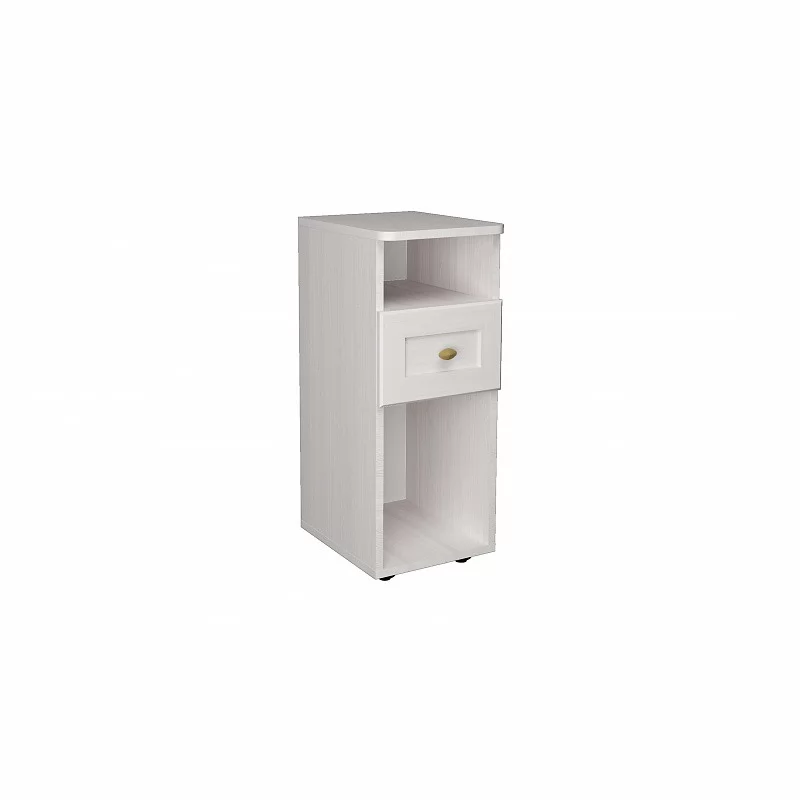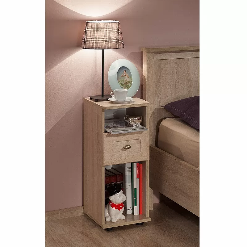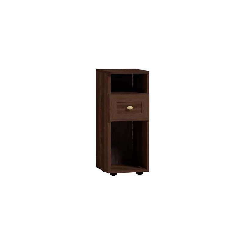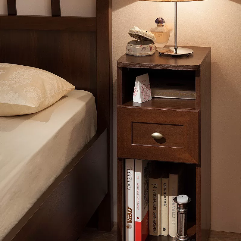 Высокая и узкая (всего 282 мм) прикроватная тумбочка в английском стиле идеально дополнит классический интерьер спальни. Столешница тумбы со скруглёнными углами. Выдвижной ящик глубиной 30 см, высотой 12 см и шириной 22 см на шариковых направляющих, которые обеспечивают минимальный люфт и плавность хода. В высокой нише можно хранить планшет, высокие журналы и альбомы. Чтобы не занимать место на столешнице, мы рекомендуем навесить над тумбочкой бра или модные потолочные светильники на длинных подвесах.