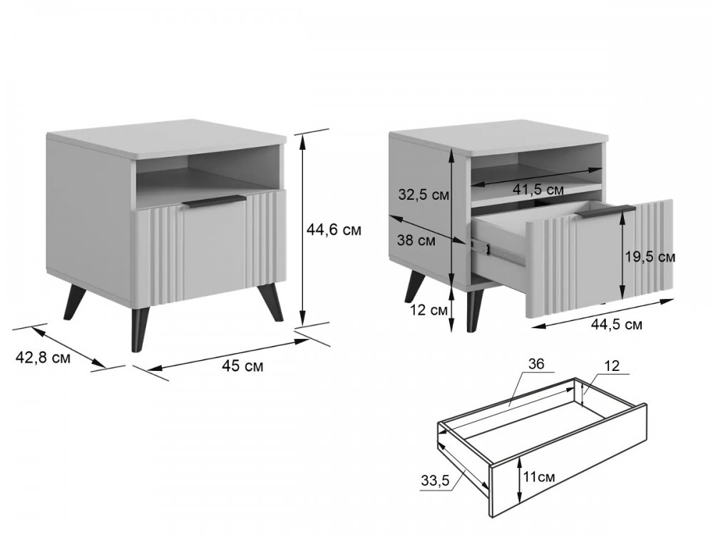 Благодаря компактным размерам тумба легко впишется в любой интерьер и гармонично сочетается с другими модулями спальни «Катрин». Выкатной ящик на шариковых направляющих обеспечивает удобный доступ к вещам, а нерегулируемые пластиковые опоры гарантируют стабильность конструкции.