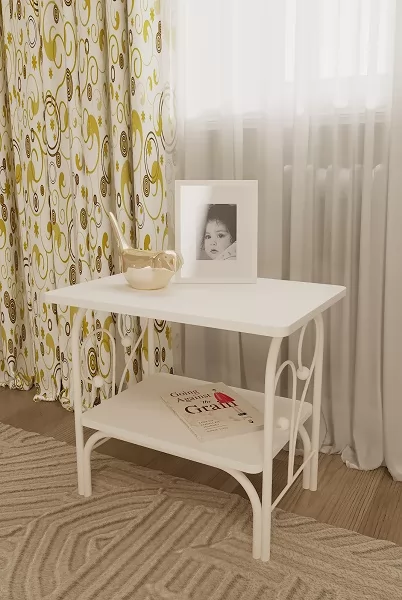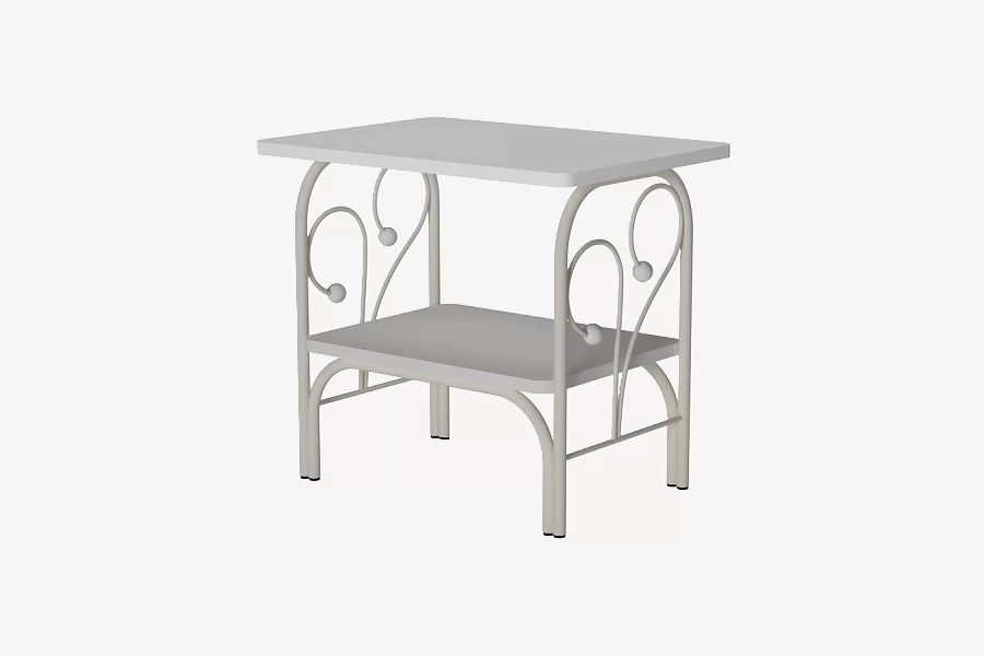 Изящная прикроватная тумба имеет металлический каркас, а столешница и полочка выполнены из ЛДСП.