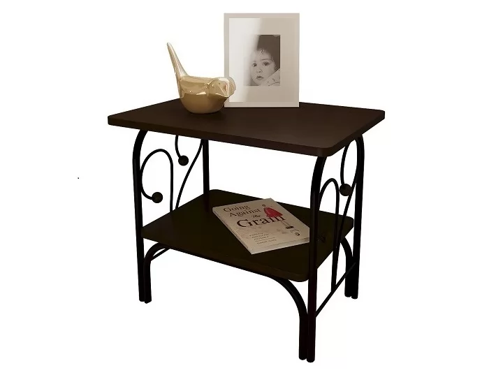 Изящная прикроватная тумба имеет металлический каркас, а столешница и полочка выполнены из ЛДСП.