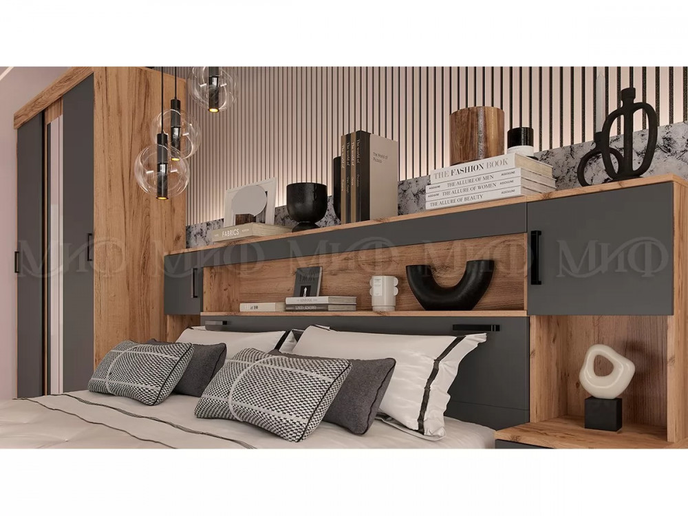 Кровать с надстройкой с тумбами 1600 Басямиф, графит/дуб крафт