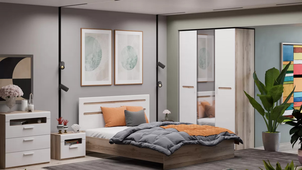 Спальный гарнитур «Фьюжн» стандартный без шкафа Дуб Делано, Белый глянец