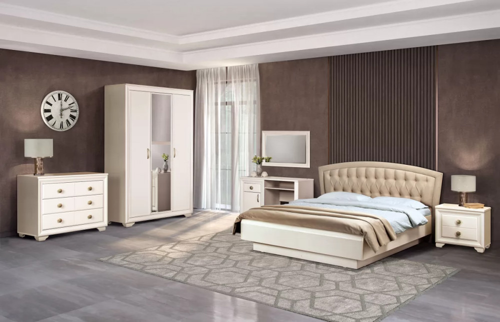 «кремовый белый», который уже успел полюбиться клиентам фабрики по серии «Марлен», но отличается более современным дизайном. В нем отсутствуют замысловатые декоративные элементы и колонны, на первый план выходят прямые линии. Украшением комплекта служат оригинальные итальянские ручки золотистого цвета. В оформлении фасадов комода сделан необычный ход. Некоторые линии, делящие ящики на, казалось бы, самостоятельные отсеки, на самом деле являются фрезеровкой. Кровать оснащена мягким тканевым изголовьем, что является сейчас безусловным трендом.