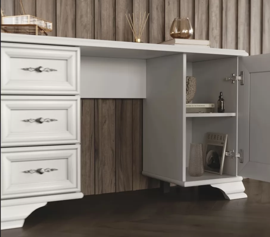 Модель сочетает в себе стильный вид и практичность. Выдвижные ящики слева станут отличным местом для хранения аксессуаров, косметики и других мелочей. Вместительные ниши за распашной дверцей слева поместят в себя парфюмерию и уходовые средства.