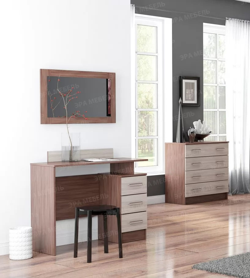 Трюмо "ЭКО" – это комфортабельный тулетный стол, в котором нет ничего лишнего. Мебель выполнена из надёжного и крепкого ЛДСП. Трюмо имеет следующие характеристики: высота – 780 мм, глубина – 390 мм, ширина – 1000 мм. Стол состоит из нескольких отделов: рабочей поверхности, открытой полки под столешницей и трёх выдвижных ящиков. В них достаточно места для хранения книг, документов и канцелярии. Поверхность мебели имеет надёжное покрытие, защищённое от повреждений.